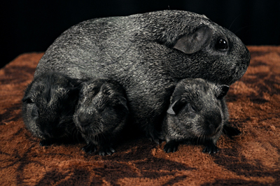 Shown here with their dam, Minky. The Mini Minkies look just like their mom and brother Moo. All three babies spent time as classroom pets before going home with their new families. The girls each had one litter for us, they are the dams of all our silver solid carriers. Sire was show quality silver solid boar, bred to Minky prior to her coming to our caviary.