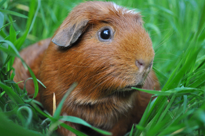 Skinny pig, bi-color red and white from Margaret's Hairless (through Skinny Guinea Piggy) (CA). Clara is mostly white with a few nicely placed red spots. She's a bold and curious guinea pig.