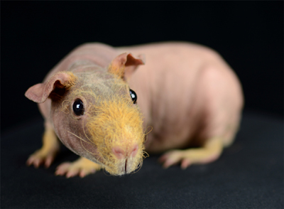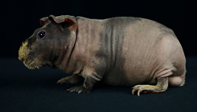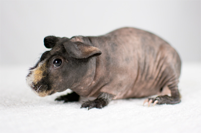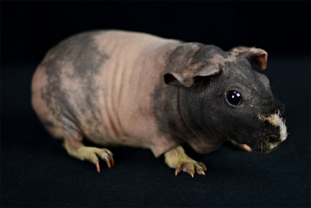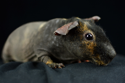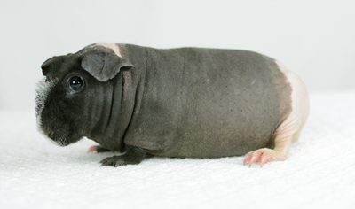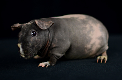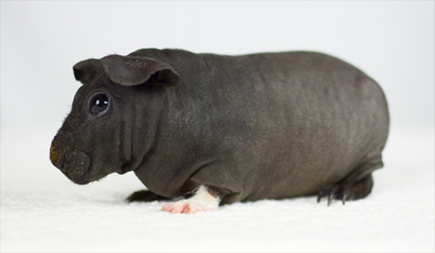 Skinny pig, gold solid and one white sock (front left foot). Her sire is Sundae and her dam is Heather. Black Beauty has very little fur and beautiful dark skin.
