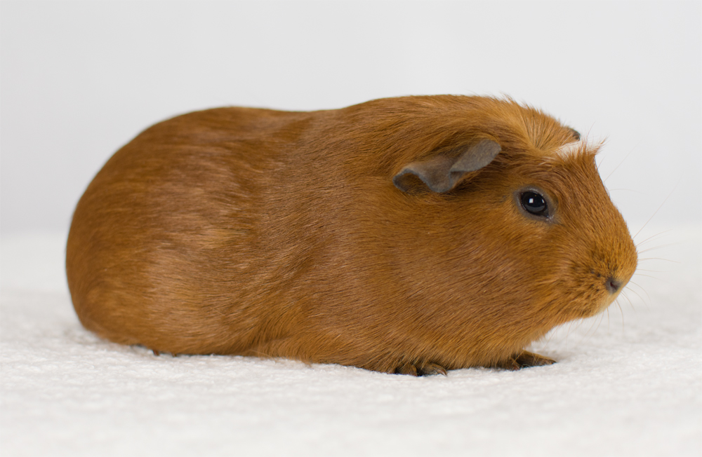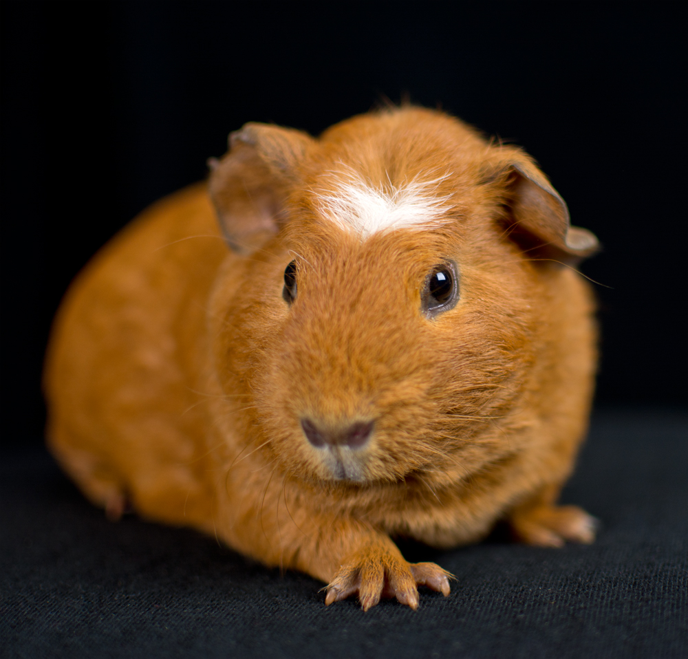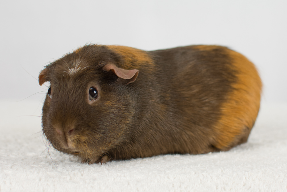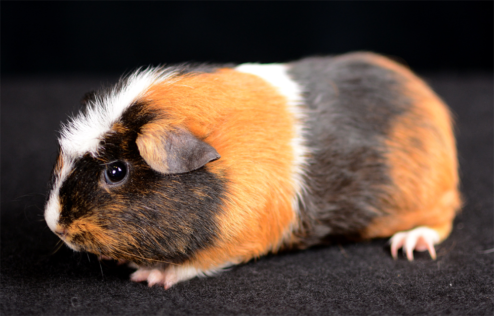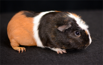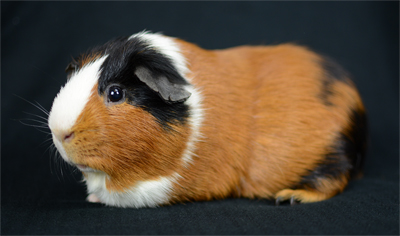 Skinny pig, tri-color roan. Chewy is an energetic, curious pig who likes to explore everything with her mouth.