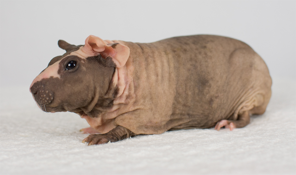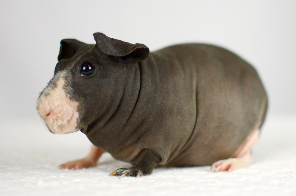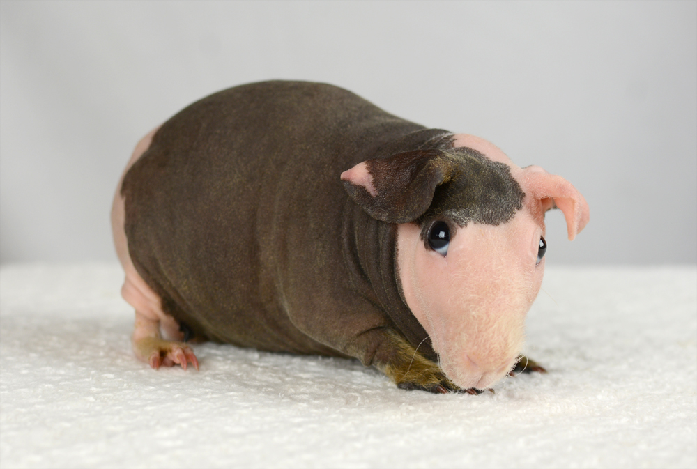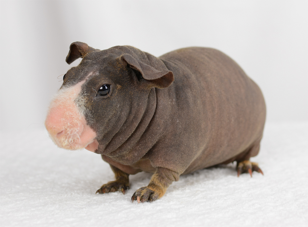 Skinny pig, buff/creme solid (ticked). Sired by Sundae, his dam is Pebble. Bucky is a beautiful dark grey color with a little light-colored triangle on his forehead. He has big floppy ears and very minimal fur on his nose and feet.