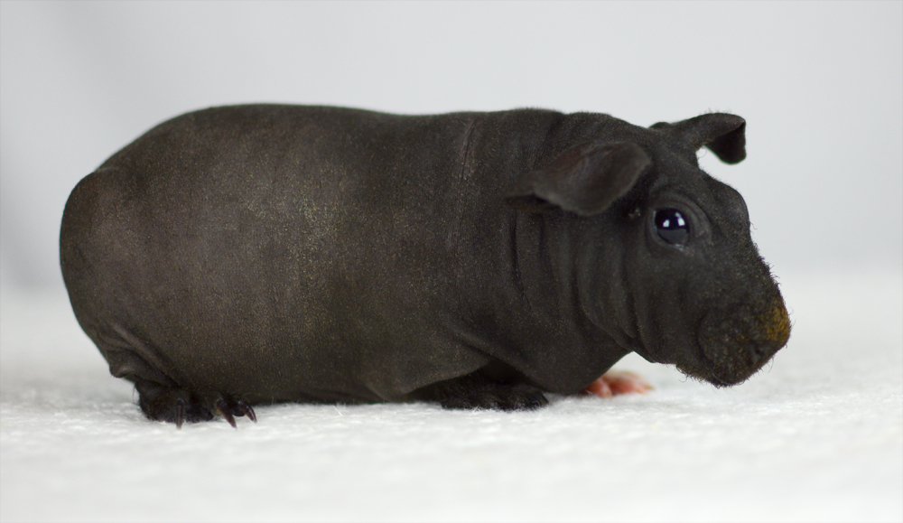 Skinny pig, self black. Sired by Winston, his dam is Pippa. Mr. Black is a gorgeous boy with rich, black skin.