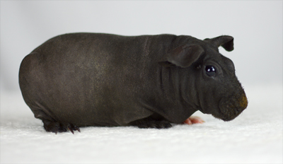 Skinny pig, Self black. Her sire is Sundae and her dam is Heather. Pippa is a beatiful black color with just a little fur.