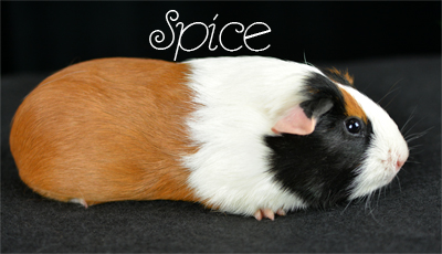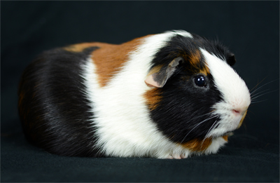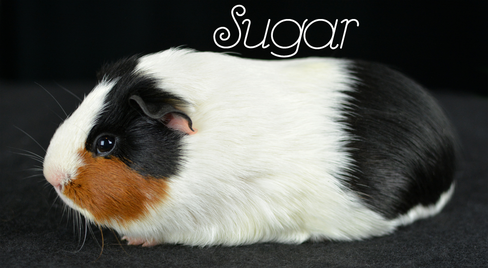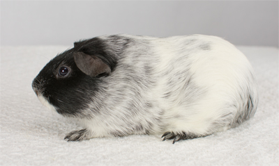 Skinny pig, Black broken with white. Her sire is Sundae and her dam is Oreo. She has a nice mix of black and white color, with a white spot inside her left ear, and a tiny black dot on her rear end.