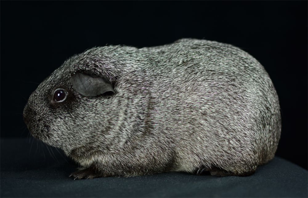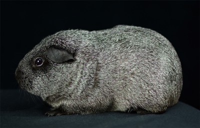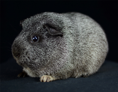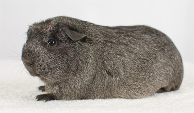 Skinny pig, roan black and white (speckled pattern). Her sire is Sundae and her dam is Shadow. She's a sweet, gentle guinea pig.