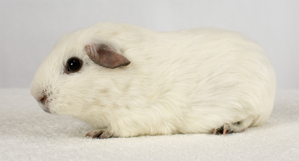 Skinny pig, dark eyed white. Her sire is Winston and her dam is Etta (aka Minnie). Toasted Marshmallow is a beautiful girl with white fur and ashy grey skin!
