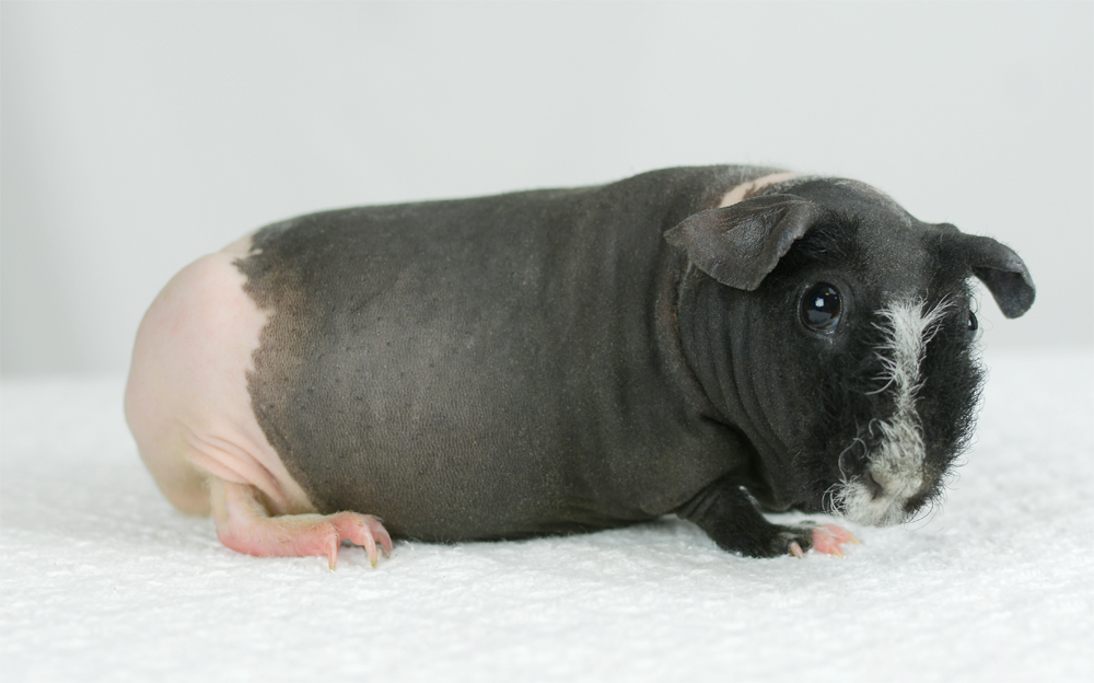 Skinny pig, pink eyed white. Sire of several of our carriers, Flash was the start of our breeding program and came from Sasha Kim's caviary (CA). He has a great temperament and loves lots of attention.