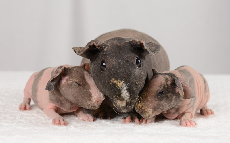 What looks like a tiny hippopotamus and squeaks every time you open the refrigerator? It's a skinny pig! Guinea pigs of this special breed only have fur on their noses and the tops of their little Hobbit feet. Our herd is a rainbow of different coats and colors, and we sometimes have babies for sale. Check out our available piggies page, or learn more about this unique and special breed!