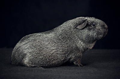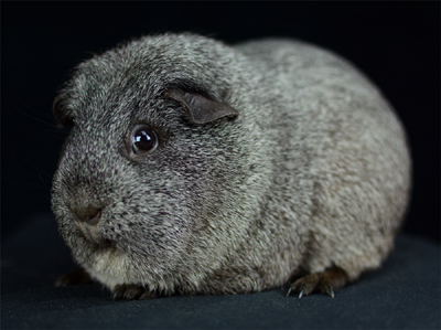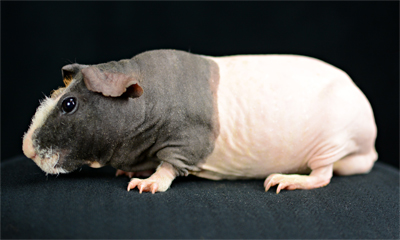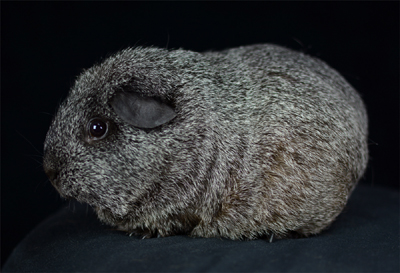 Skinny pig, roan black and white (speckled pattern). Her sire is Sundae and her dam is Shadow. She's a sweet, gentle guinea pig.