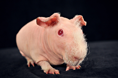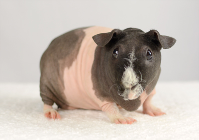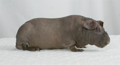 Skinny pig, pink eyed white. Sire of several of our carriers, Flash was the start of our breeding program and came from Sasha Kim's caviary (CA). He has a great temperament and loves lots of attention.