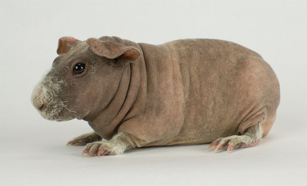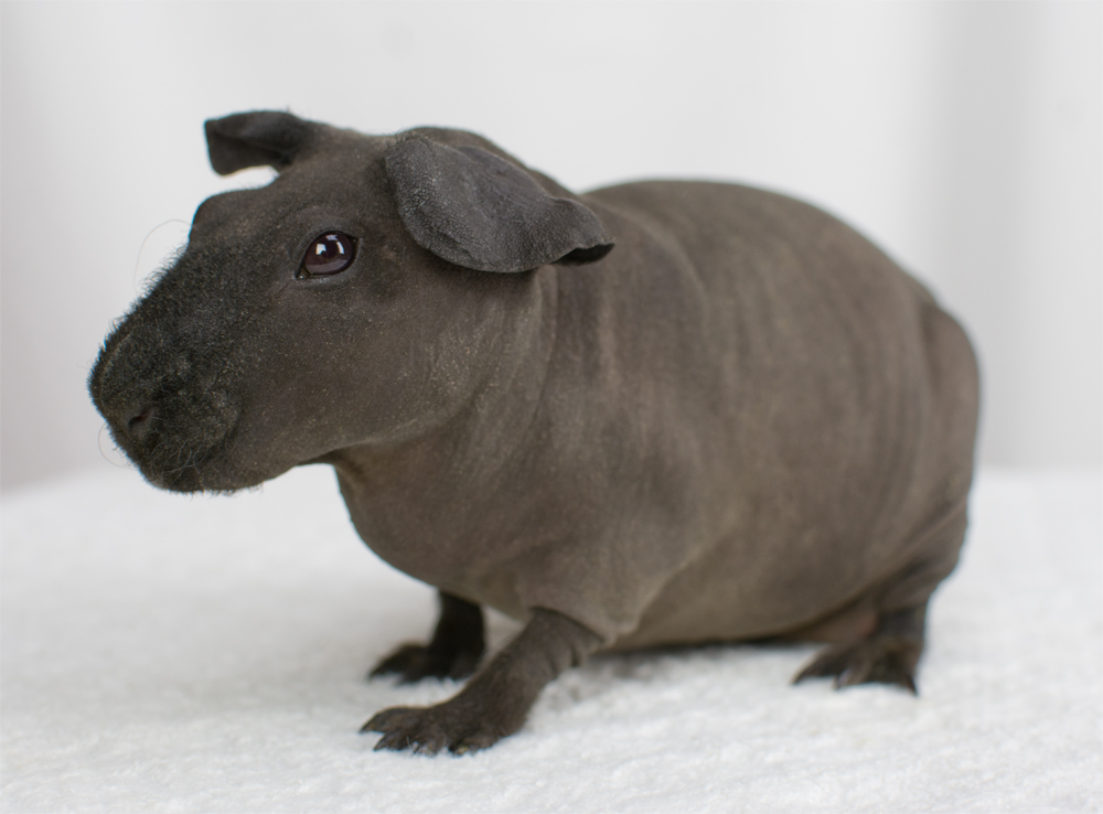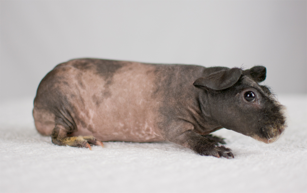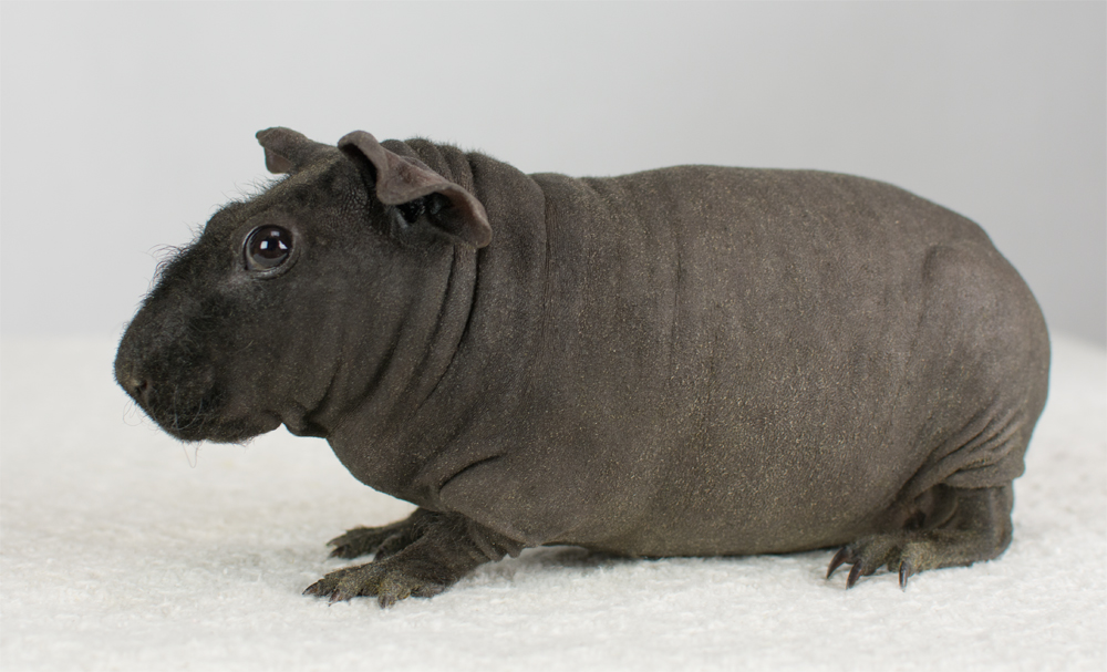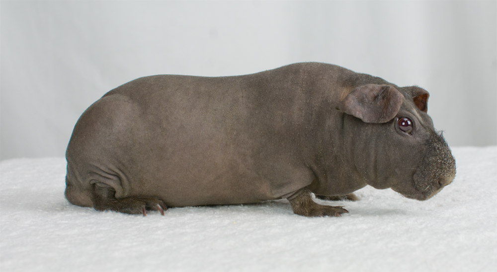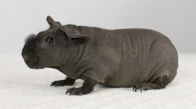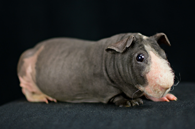 Skinny pig, buff/creme solid (ticked). Sired by Sundae, his dam is Pebble. Bucky is a beautiful dark grey color with a little light-colored triangle on his forehead. He has big floppy ears and very minimal fur on his nose and feet.