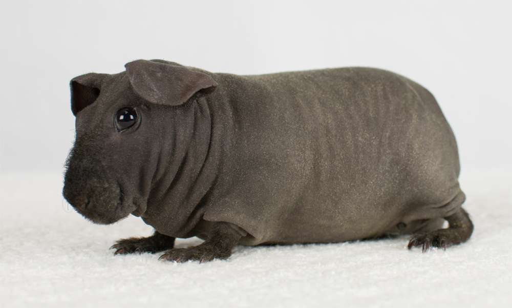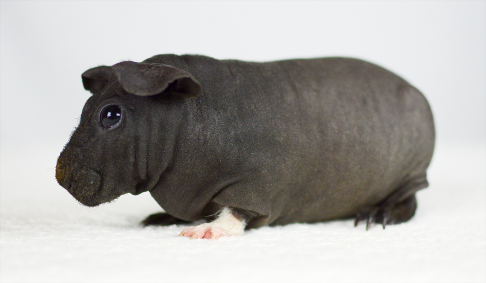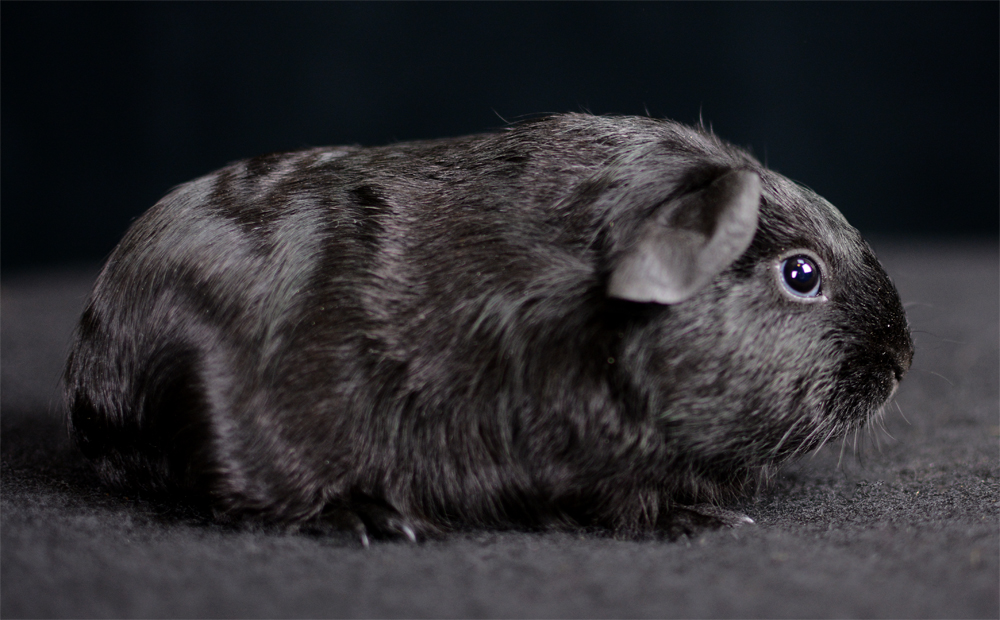Skinny pig, self black. Sired by Winston, his dam is Pippa. Mr. Black is a gorgeous boy with rich, black skin.