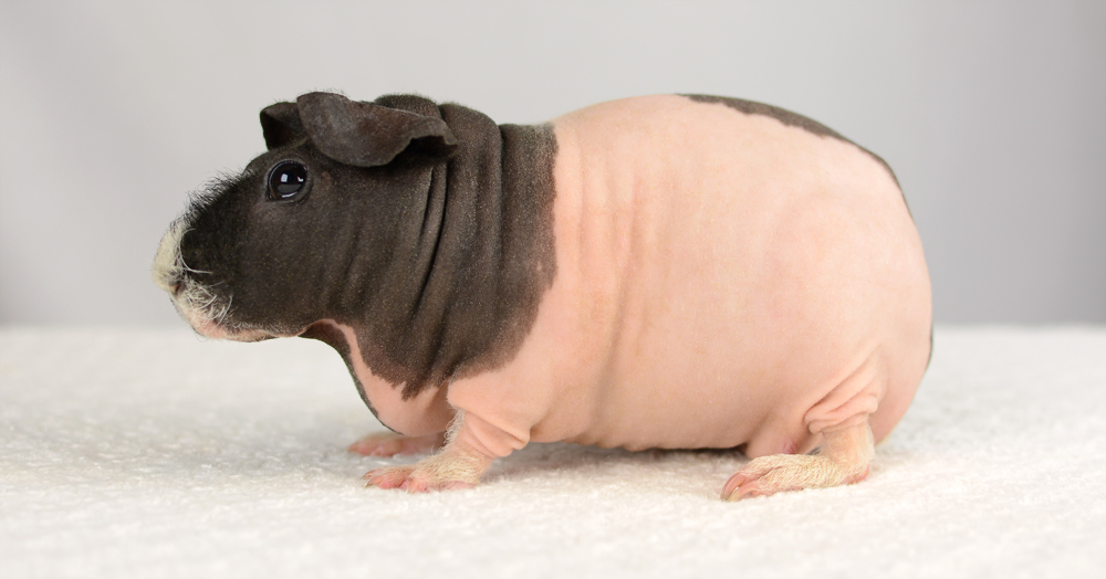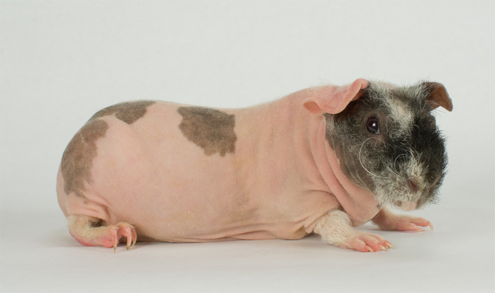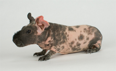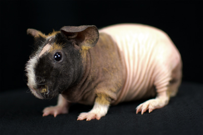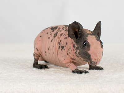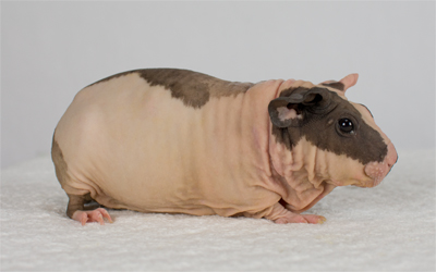 Skinny pig, tortoise shell and white from Margaret's Hairless Guinea Pigs (CA). Sunday is the sire of some of our newest skinny babies!