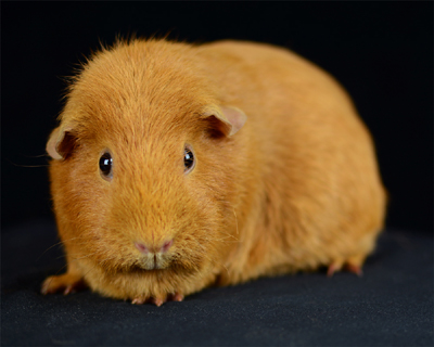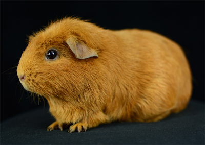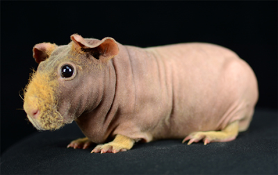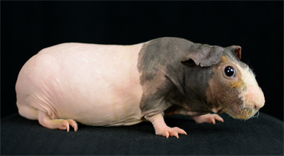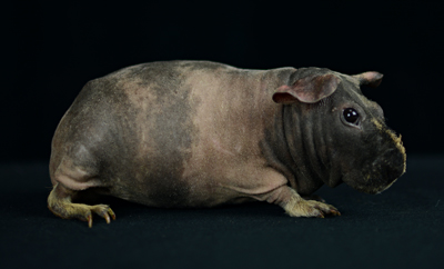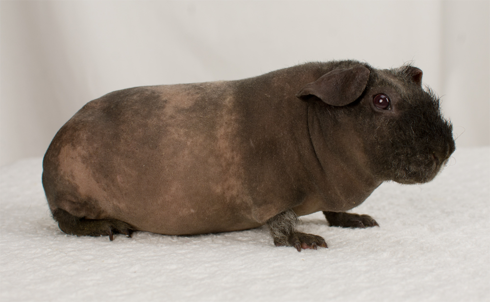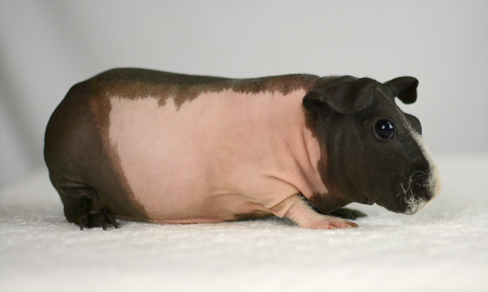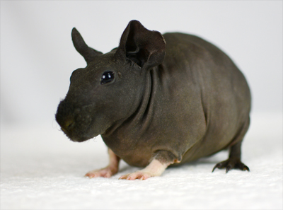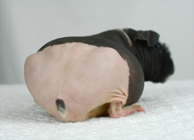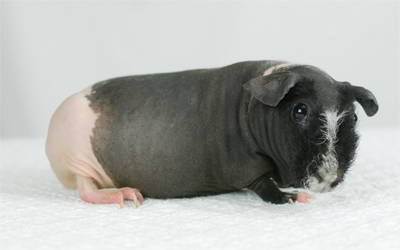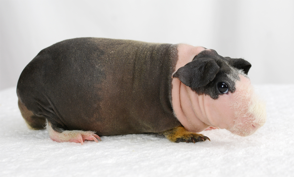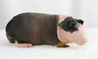Skinny pig, gold solid and one white sock (front left foot). Her sire is Sundae and her dam is Heather. Black Beauty has very little fur and beautiful dark skin.