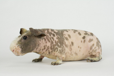 Skinny pig, bi-color red and white from Margaret's Hairless (through Skinny Guinea Piggy) (CA). Clara is mostly white with a few nicely placed red spots. She's a bold and curious guinea pig.