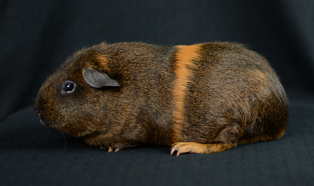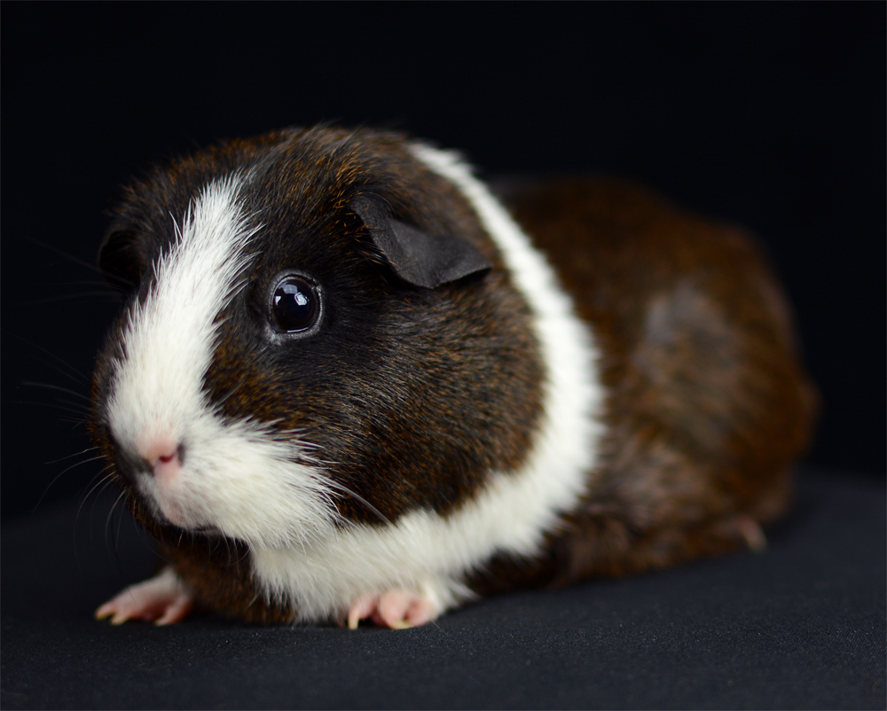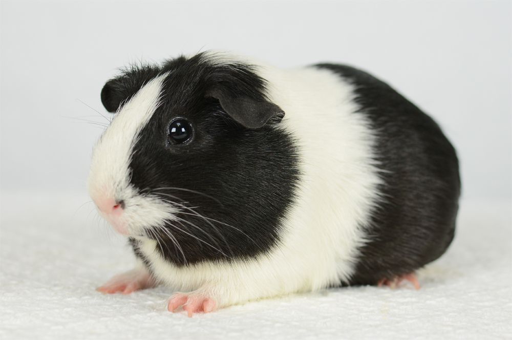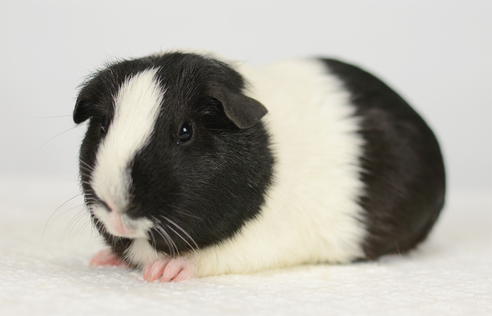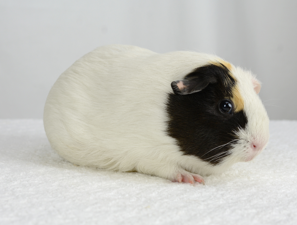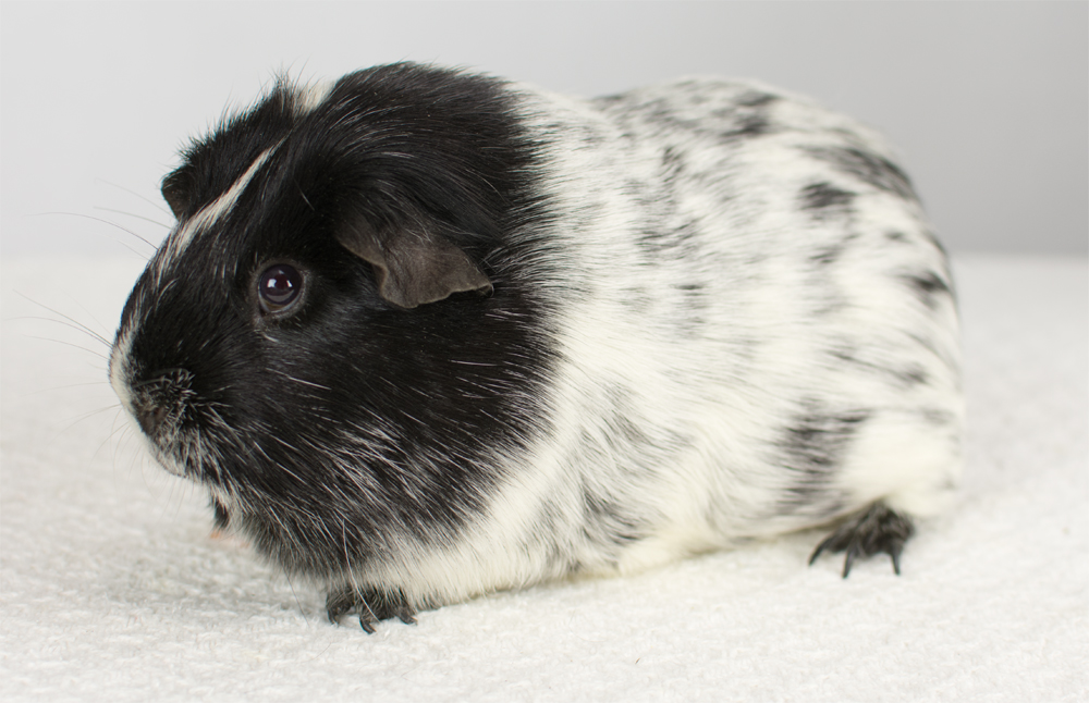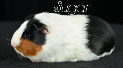 Skinny pig, Black broken with white. Her sire is Sundae and her dam is Oreo. She has a nice mix of black and white color, with a white spot inside her left ear, and a tiny black dot on her rear end.