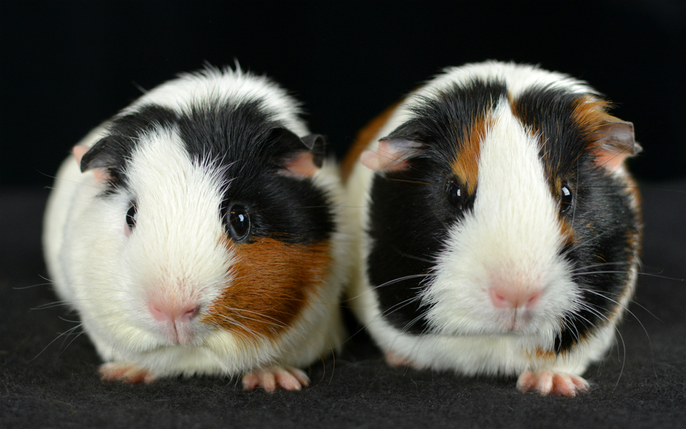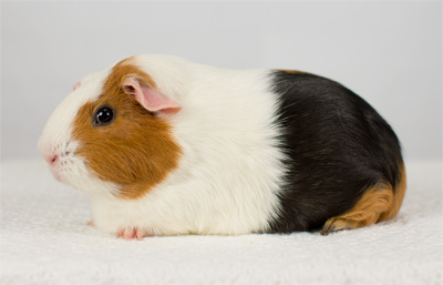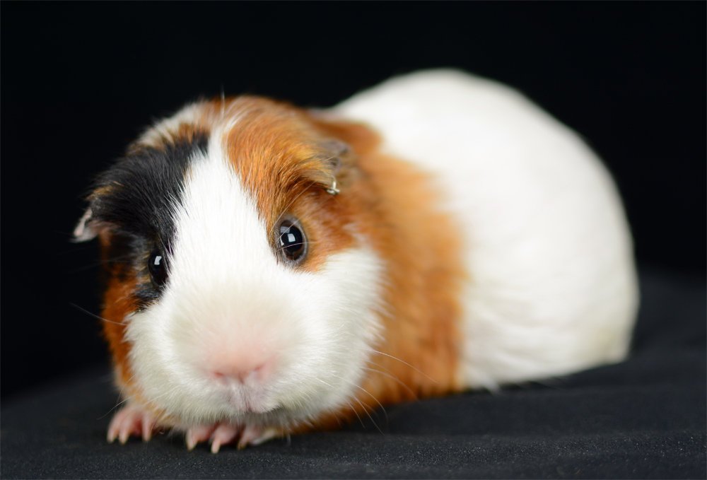 Skinny pig, tri-color roan. Chewy is an energetic, curious pig who likes to explore everything with her mouth.