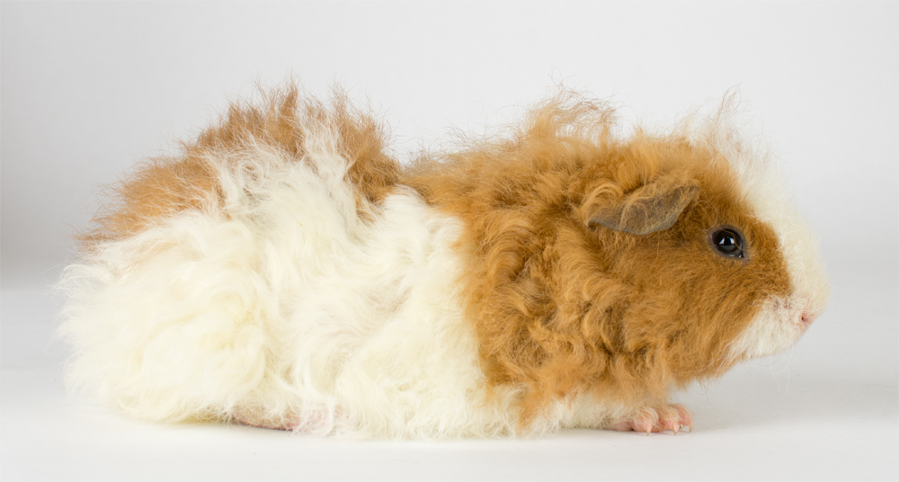 White-crested American skinny carrier, chocolate broken with gold (and two white feet) from Cavyland Cuties (CA). Anna is a sweet little guinea pig with soft fur and a little crest.