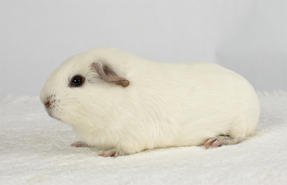 Skinny pig, dark eyed white. Her sire is Winston and her dam is Etta (aka Minnie). Toasted Marshmallow is a beautiful girl with white fur and ashy grey skin!